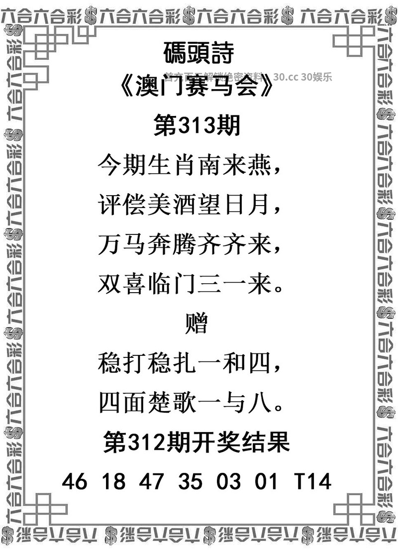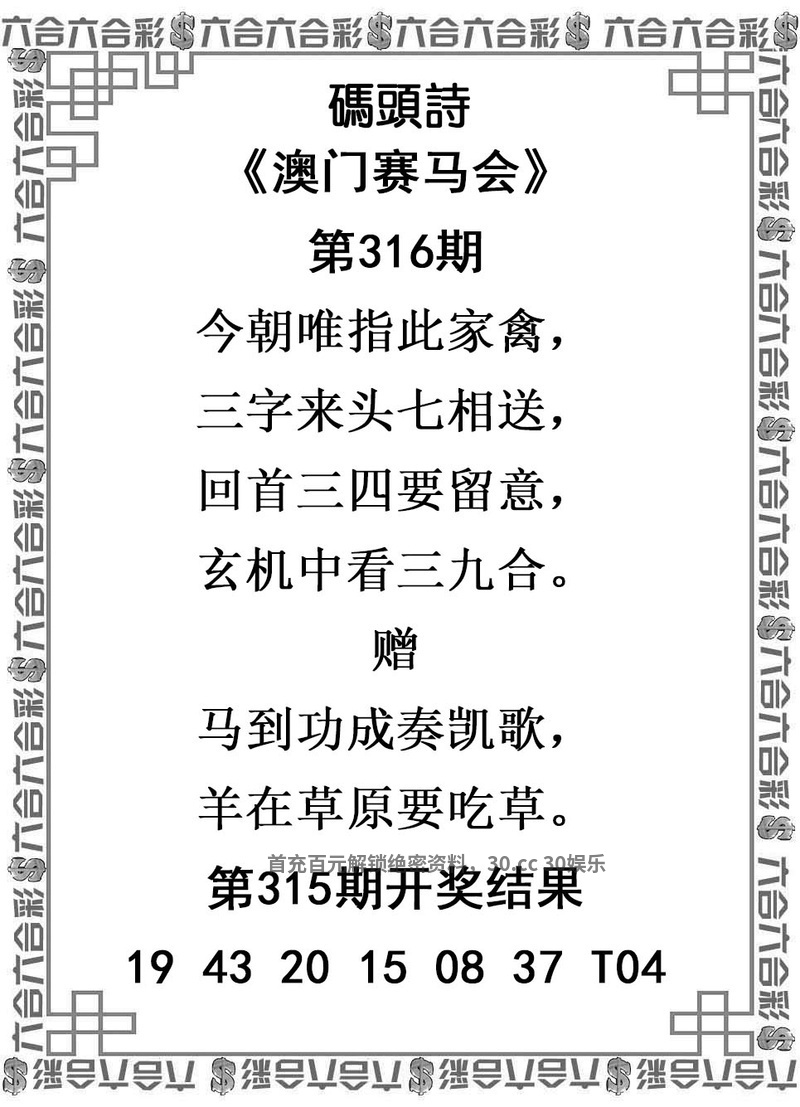 | 315期:【老跑狗特码诗】开【虎04】 玄机詩雲:始信本来無一物,好名多磨过三河。悠閒安逸,坐定粒六。始信本来無一物。无欲无求,表面難看。好名多磨过三河。 诗句解:无欲无求解无边肖牛羊兔鼠马虎。 |